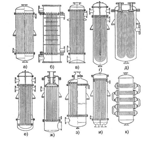 По предназначению теплообменное оборудование предназначено для: подогрева или охлаждения, испарения, конденсации, сублимации, дистилляции. По движению теплоносителя есть: прямоточные, противоточные, с перекрестным или смешанным движением потоков.